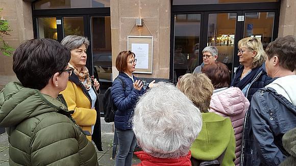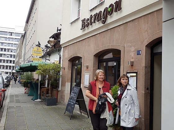 Erstes Ziel war Nürnberg, wo wir Betriebsseelsorgerin Barbara März in einem besonderen Lokal trafen. Im „Estragon“ werden Menschen beschäftigt, die aufgrund einer Behinderung oder sonstiger Probleme nicht vermittelt werden können. Sie werden von Fachkräften ausgebildet und dabei unterstützt, wieder im Arbeitsleben Fuß zu fassen. Barbara März erzählte von den Arbeitsschwerpunkten (Handelsangestellte, FernfahrerInnen) der Betriebsseelsorge und machte uns auch auf die „Straße der Menschenrechte“ aufmerksam, an der auf Säulen verteilt die 30 Artikel der Menschenrechte in verschiedenen Sprachen geschrieben stehen.