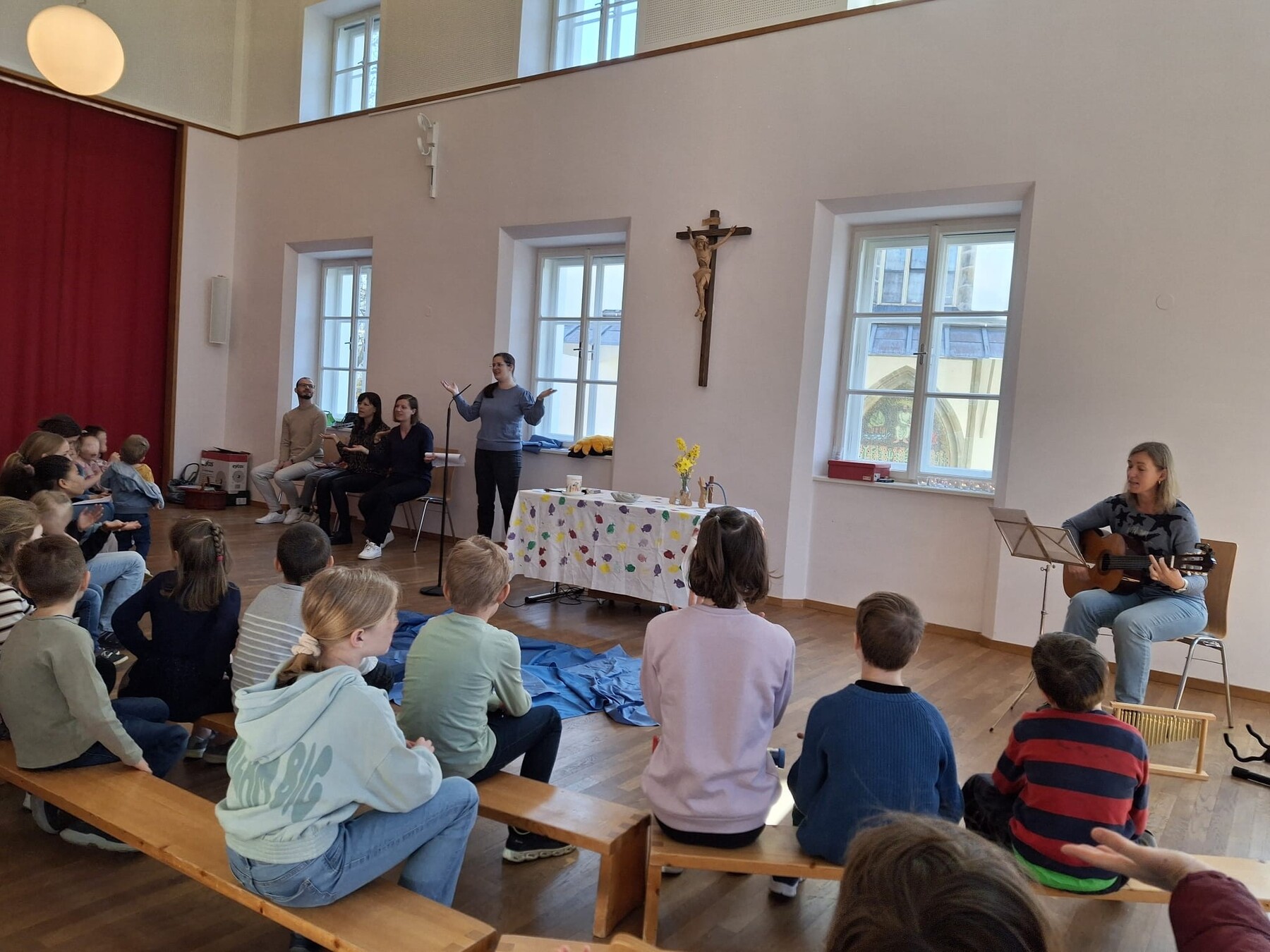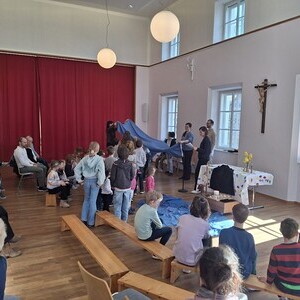 Am 5. Fastensonntag feierte eine große Kinder- und Familienschar einen Kindergottesdienst im Gallus-Saal. Das KiLi-Team erzählte in der wundervollen Feier die Geschichte wie Jesus einen Sturm auf dem See besänftigte und damit seinen Jüngern half. Dabei wurde mit dem Schwungtuch der Wellengang und Wind für die mitfeiernden Kinder erfahrbar um die ängstlichen Jünger im Boot besser zu verstehen. Die starke Botschaft: Gott ist auch und gerade in stürmischen Zeiten für uns da! Jesus schenkt uns neuen Mut!