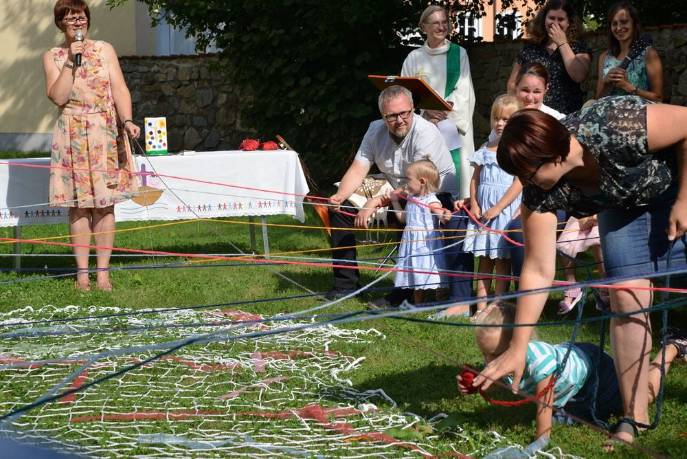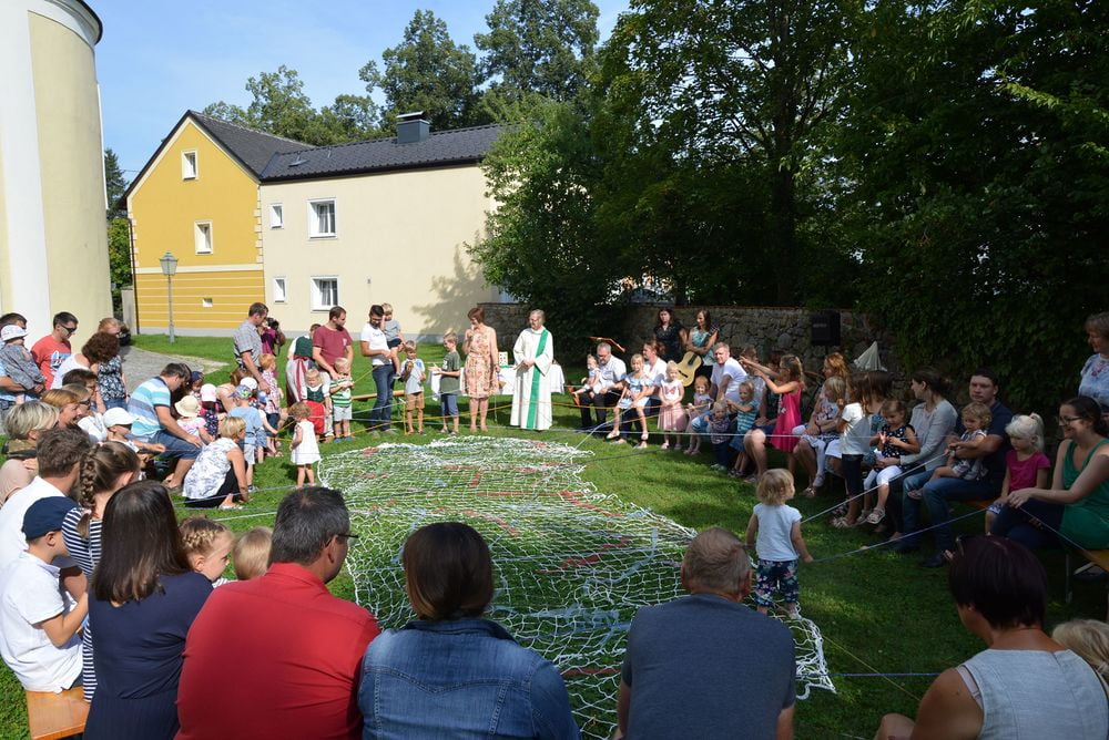 Anlässlich des Sommerfestes der Pfarre feierten wir an diesem sonnigen Sonntag die Kinderkirche im Freien. Wir dachten in dieser Kinderkirche besonders über die Freundschaft und die Familie nach. Wir verglichen die Familie oder unsere Freundschaften mit einem Netz und sahen einige Gemeinsamkeiten. Ein Netz - unser Freundschaftsnetz – breiteten wir auch in der Mitte der Feiergemeinschaft auf. Über dieses Freundschaftsnetz haben wir ein neues Netz entstehen lassen. Dazu warfen wir uns ein Wollknäuel nacheinander zu und bemerkten dann, dass wir alle ein wichtiger Teil sind, damit das Netz zusammenhält. Nach dem Jungscharlied wurden die Kinder darauf aufmerksam gemacht, dass im von uns ausgebreitetem Netz Freundschaftsbänder versteckt waren. Jedes Kind durfte sich ein Freundschaftsband aus dem großen Netz holen und es einem Freund oder Sitznachbar schenken. Das Freundschaftsband soll uns an das große Netz erinnern, das uns unsichtbar miteinander und mit Gott verbindet. Abschließend zogen wir in die große Kirche ein und sangen unserem Pfarrer Mag. Hans Padinger dort ein Ständchen zu seinem 25-Jahr Jubiläum Pfarrer von Peuerbach. Wie schön, lieber Pfarrer, dass wir dich hier in Peuerbach haben. Du schaffst es immer wieder, das unsichtbare Netz mit Gott zu spannen.