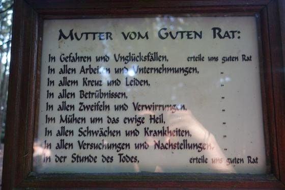 Der Weg zur "Maria vom guten Rat" ist eine beliebte Strecke zum Spazieren Gehen. Durch den Wald am Hausruckkamm entflieht man schnell dem Alltag, begleitet von den vielfältigen Stimmen der Vögel. Unterwegs bieten sich zwischen den Bäumen immer wieder Tiefblicke nach Osten und Westen. Festtag der "Maria vom guten Rat" ist der 26. April. Tragen Sie eine Kerze zum Bild, nehmen Sie Blumen mit und verweilen Sie dort mit Ihren Anliegen vor Gott.